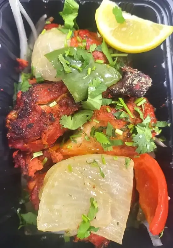 Chicken Legs Marinated Overnight In Yogurt, Spices, And Fresh Herbs. Barbecued In A Clay Oven And Served With Grilled Tomatoes, Onions Bell Peppers.